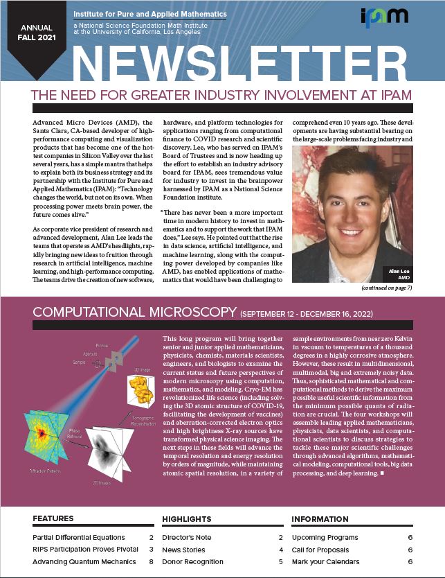 IPAM’s 2021 Newsletter highlights include industry involvement at IPAM, stories on successes in nurturing innovation across mathematical and disciplines, and the new IPAM Simons Postdoctoral program.
