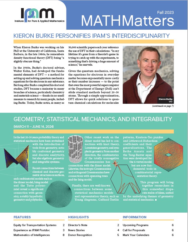 IPAM’s 2023 Newsletter highlights include industry involvement at IPAM, and stories on successes in nurturing innovation across mathematical and disciplines. You are cordially invited to read it and share it with your friends who might be interested in IPAM’s work.
